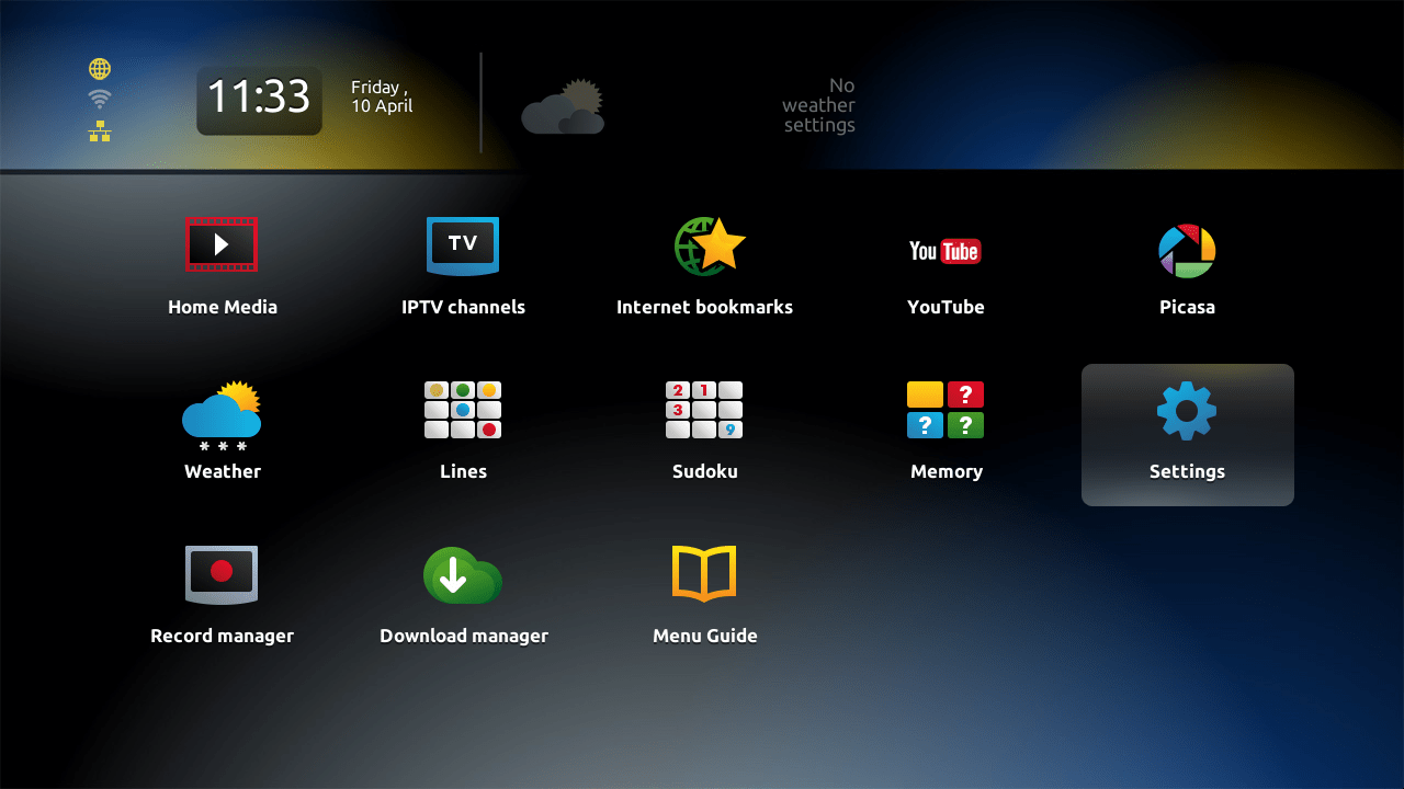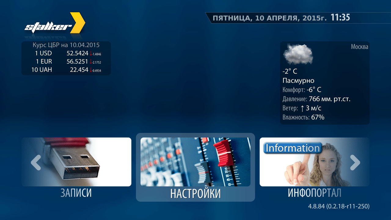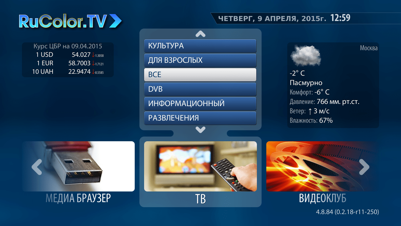 Если все настройки указаны верно то вы увидите главное меню с логотипом RUCOLOR.TV